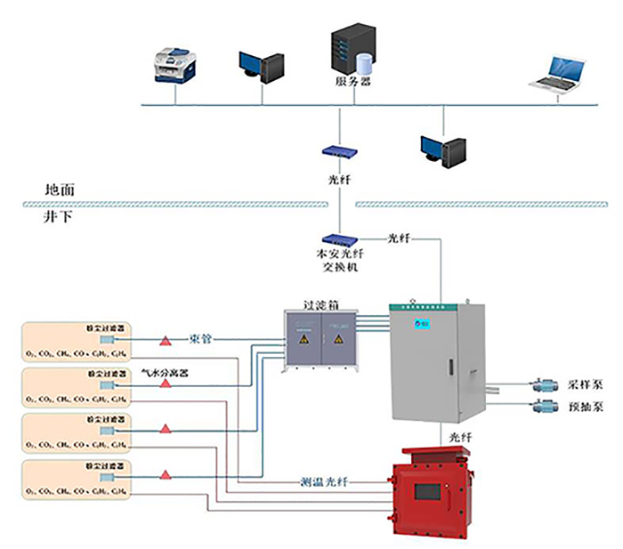 全激光礦井火災(zāi)預(yù)警系統(tǒng)是我公司研發(fā)而成的新一代煤礦火災(zāi)預(yù)防預(yù)報(bào)系統(tǒng)。本系統(tǒng)采用激光光譜技術(shù)(TDLAS)結(jié)合先進(jìn)的激光光纖測溫技術(shù)(DTS),可以對井下火災(zāi)報(bào)警要求的7種氣體實(shí)時(shí)在線監(jiān)控,國內(nèi)首次實(shí)現(xiàn)了對所有氣體的全組分激光技術(shù)監(jiān)測;對井下溫度分布式多點(diǎn)監(jiān)控,實(shí)現(xiàn)對煤礦火災(zāi)的預(yù)警預(yù)報(bào),是煤礦火災(zāi)預(yù)防預(yù)報(bào)的新一代解決方案。